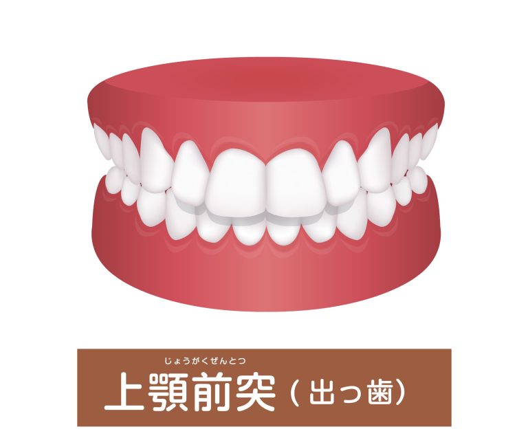 出っ歯(口コボ)は、下の歯よりも上の歯が著しく前に出ている状態です。日本人に多く、上の歯が大きく前に傾いていたり、上顎が全体的に前に出ていたりするタイプがあります。