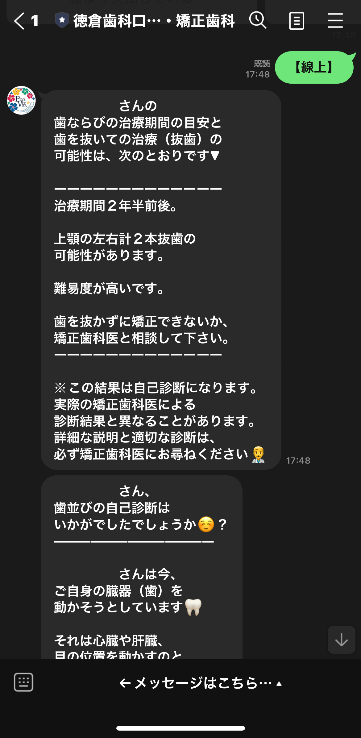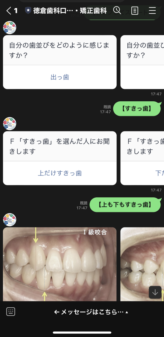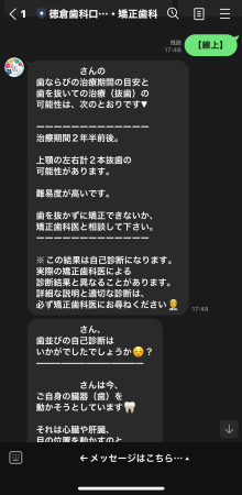 公式LINEより、歯並び矯正治療を行った場合の未来予想シミュレーションを、