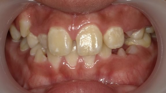| 治療内容 | 口腔衛生指導後、矯正用マウスピースを使用して歯の移動を行いました。 上顎前歯を唇側傾斜させ、下顎の前歯を舌側傾斜させることで被蓋(噛み合わせ)を改善しています。犬歯がまだ生えておりませんので、あえて、歯と歯の間にスペースを残しております。 犬歯が生えることによりスペースは閉鎖させると予測しております。 今後、乳歯の生え変わりを管理しつつ、セカンド・フェーズ(Ⅱ期治療)の開始時期を検討していきます。 |