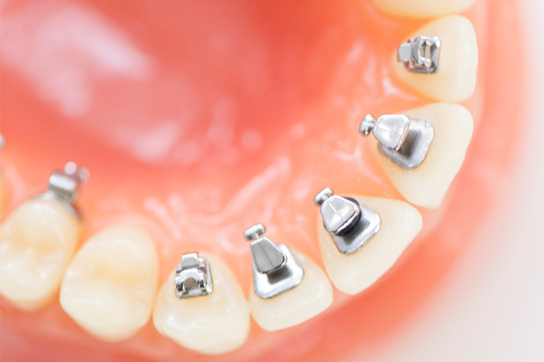 舌側矯正とは、ブロック(ブラケット)とワイヤーを歯の裏側に取り付けて歯を動かす矯正治療です。